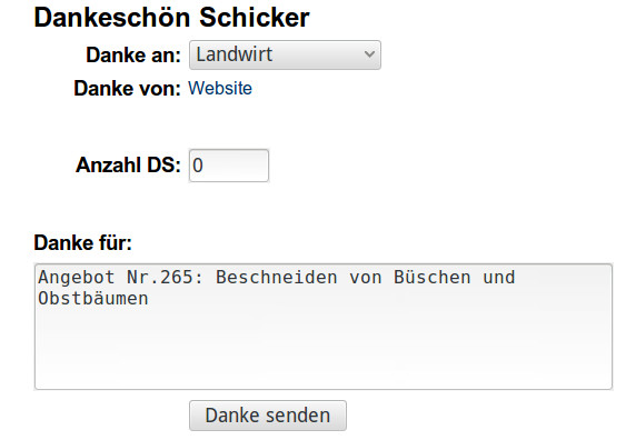 Nun in der Auswahlbox den richtigen Nickname aussuchen. Im Feld DS die Anzahl der DS (Danke Schöns) eintragen im Feld Art der Leistung den "Verwendungszweck".