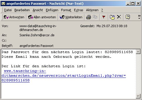 Normalerweise genügt ein Klick auf den Link in der Email - und schon bist Du eingeloggt. Falls aus irgendeinen Grund eine Emailverlinkung mit Deinem Emailanbieter - bzw. mit Deinem Emailprogramm nicht möglich ist, kann das Passwort auch manuell oder über die Zwischenablage eingegeben werden. Der Hyperlink in dieser Email funktioniert nur ein einziges mal. Nach dem Ausloggen wird dieser Link in der Email nicht mehr zum Einloggen funktionieren. Das dient der Sicherheit. Bitte logge Dich nach dem Gebrauch auch